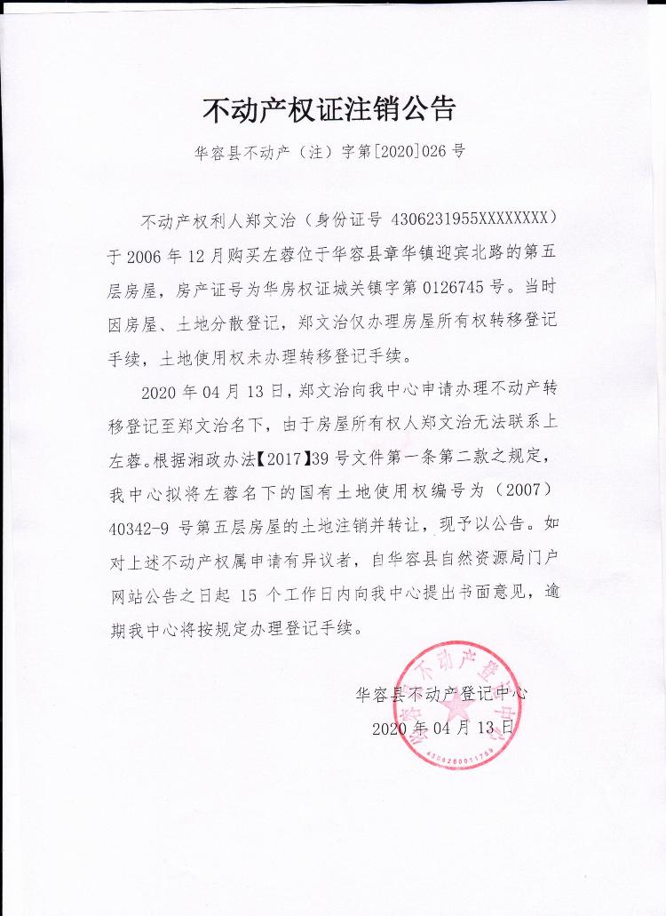 不动产权证注销公告【土地使用权证(左蓉转郑文治)】