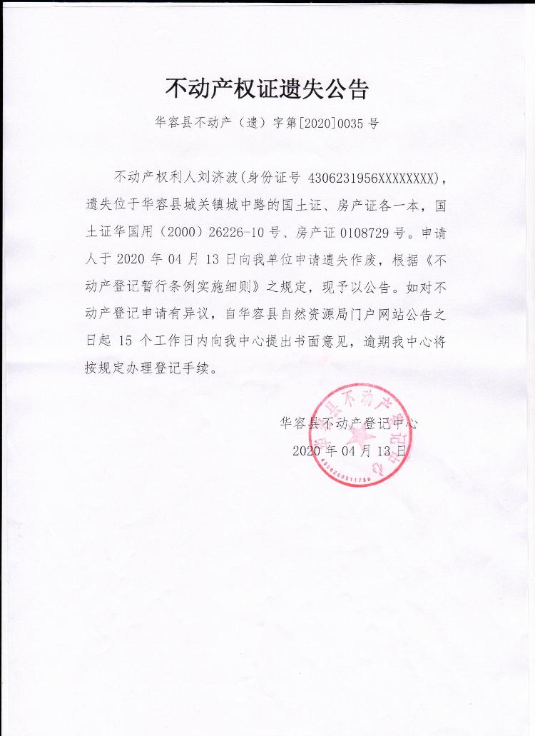 不动产权证遗失公告【国土证 房产证(刘济波)】