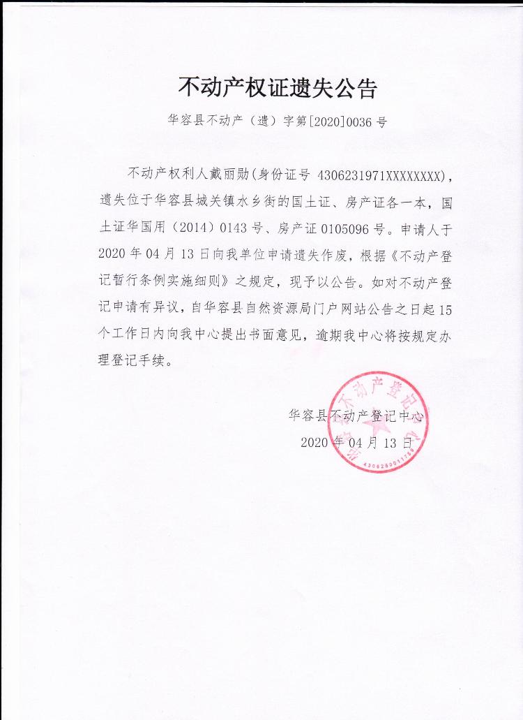 不动产权证遗失公告【国土证 房产证(戴丽勋)】