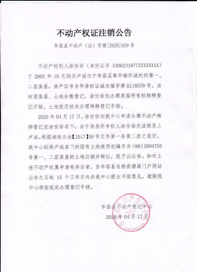 不动产权证书注销公告【土地使用权证(卢诚转涂世佑)】