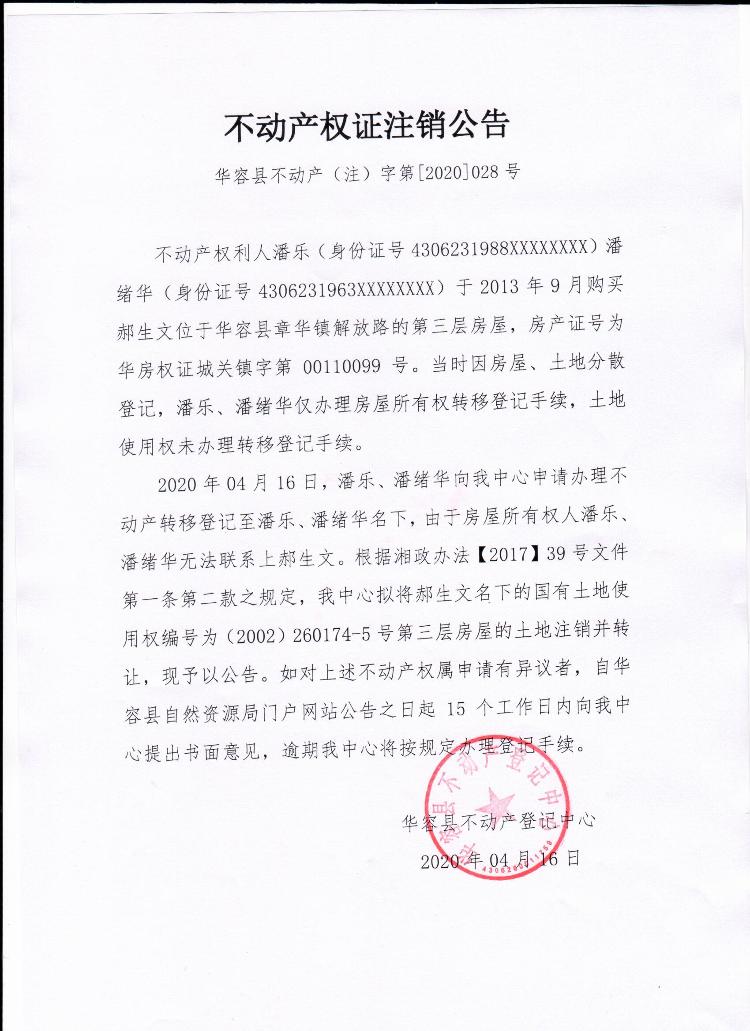 不动产权证书注销公告【土地使用权证(郝生文转潘乐 潘绪华)】