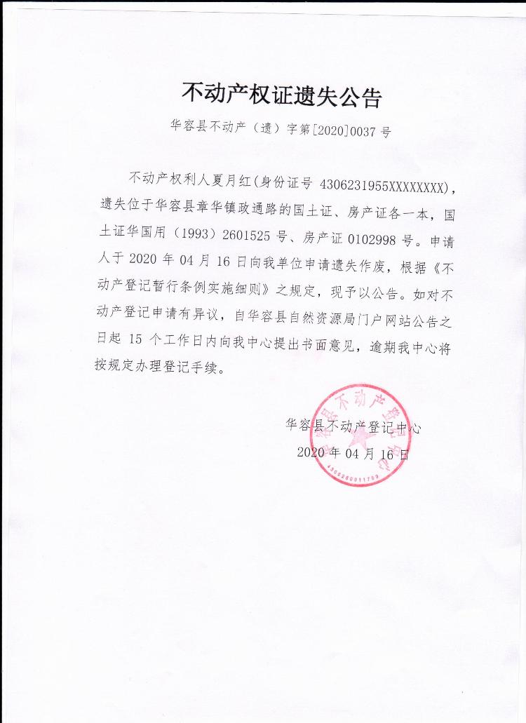 不动产权证遗失公告【国土证 房产证(夏月红)】
