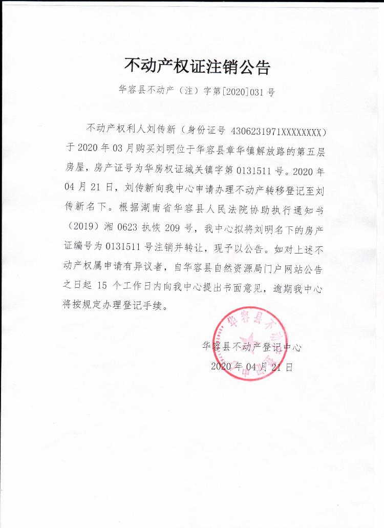 不动产权证书注销公告【房产证(刘明转刘传新)】