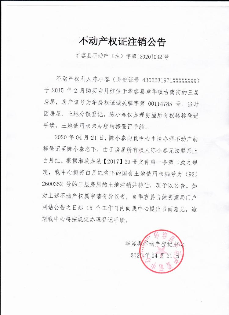 不动产权证书注销公告【土地使用权证(白月红转陈小春)】