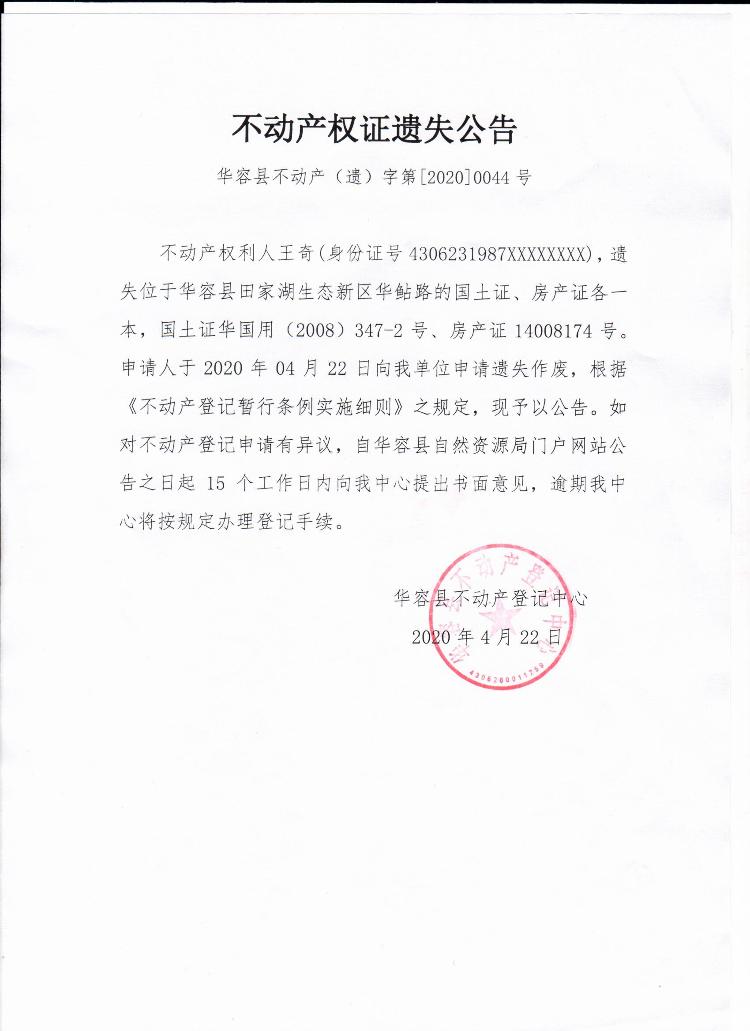 不动产权证遗失公告【国土证 房产证(王奇)】