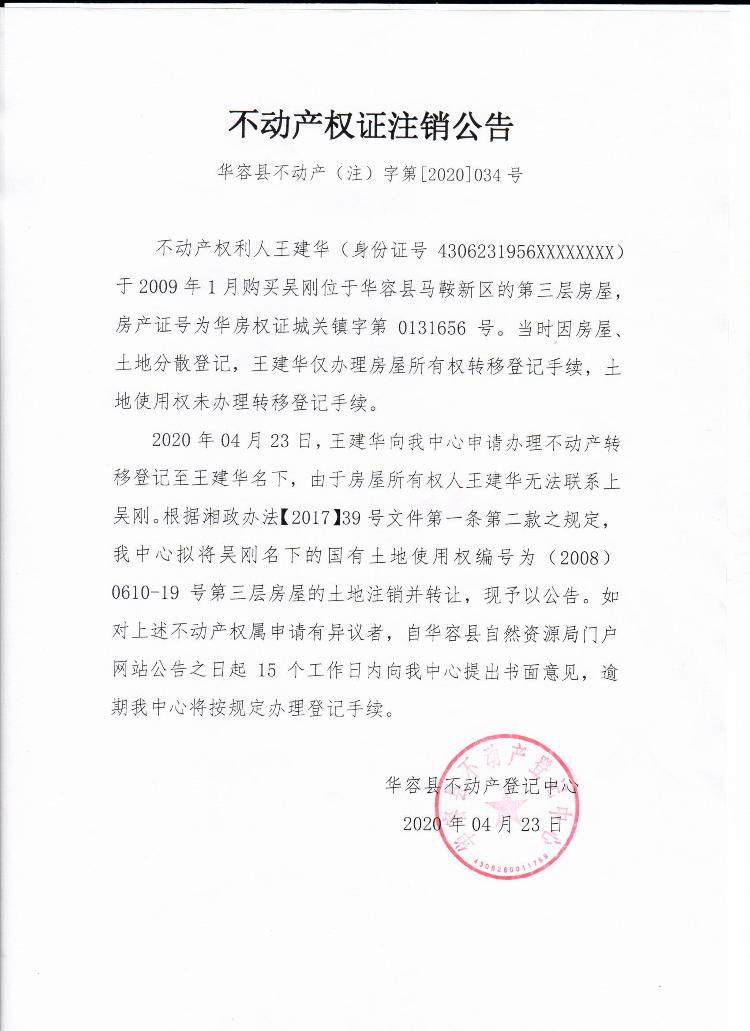 不动产权证书注销公告【土地使用权证(吴刚转王建华)】