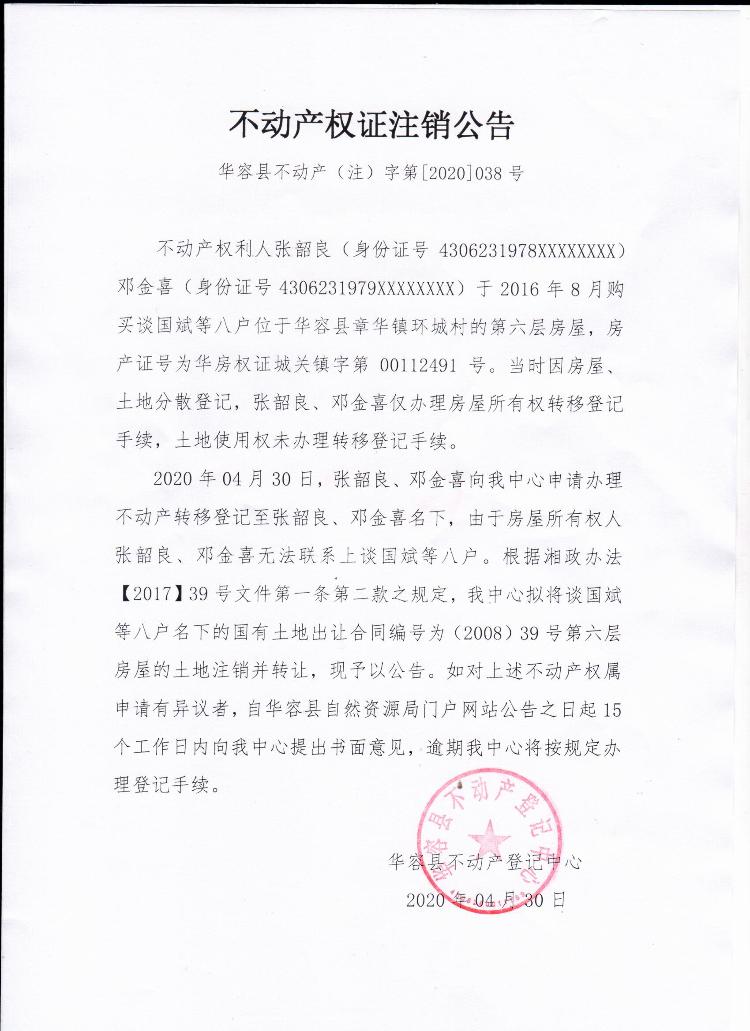 不动产权证书注销公告【土地使用权证(谈国斌等8户转张韶良 邓金喜)】