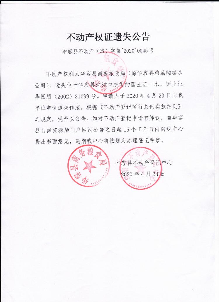 不动产权证遗失公告【国土证(华容县商务粮食局)原粮油购销总公司】
