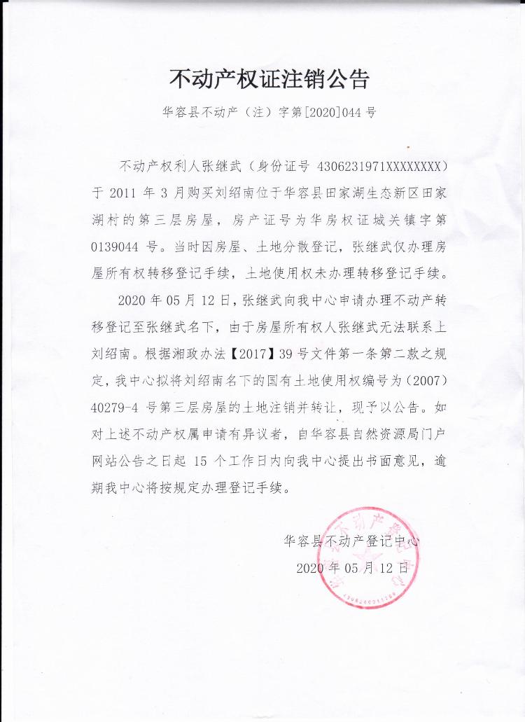 不动产权证书注销公告【(刘绍南转张继武)】