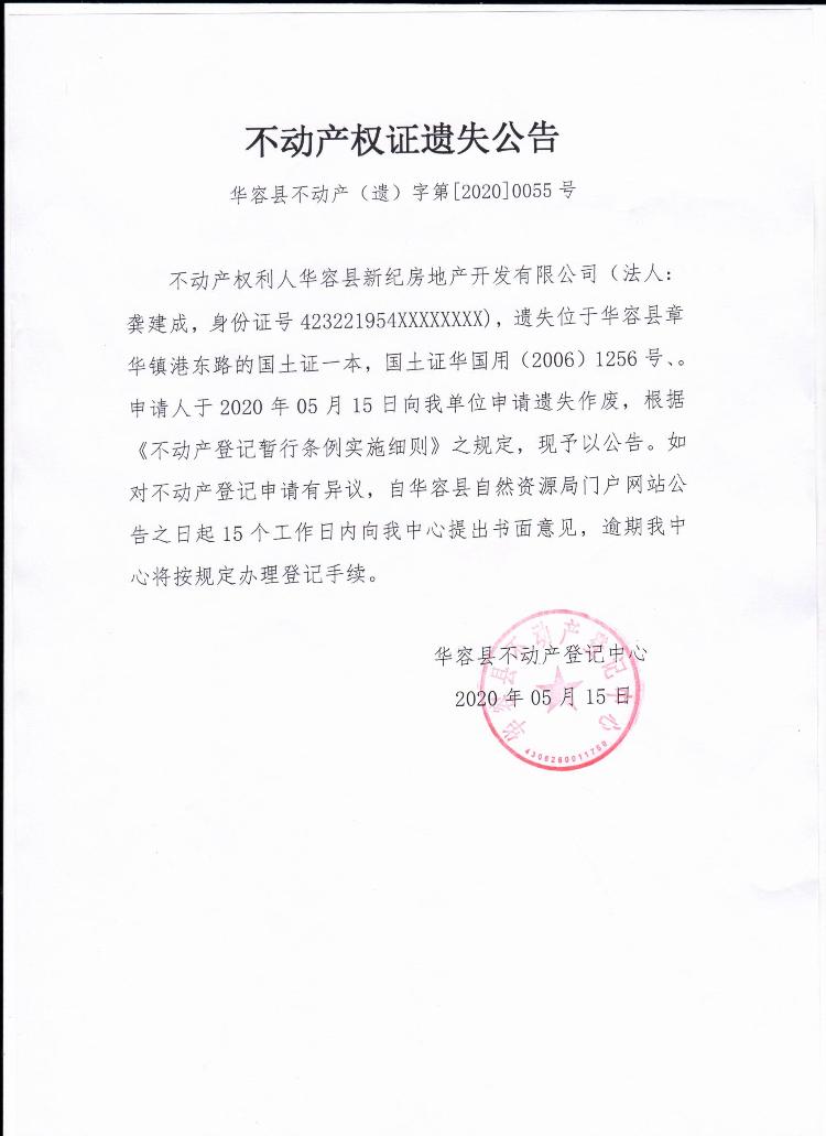 不动产权证遗失公告【国土证(华容县新世纪房地产开发有限公司)】