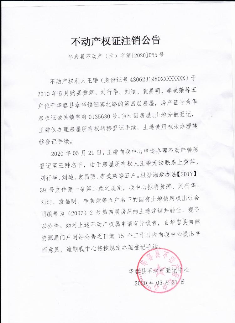不动产权证书注销公告【(黄萍 刘行华 刘迪 袁昌明 李美荣转王翀)】