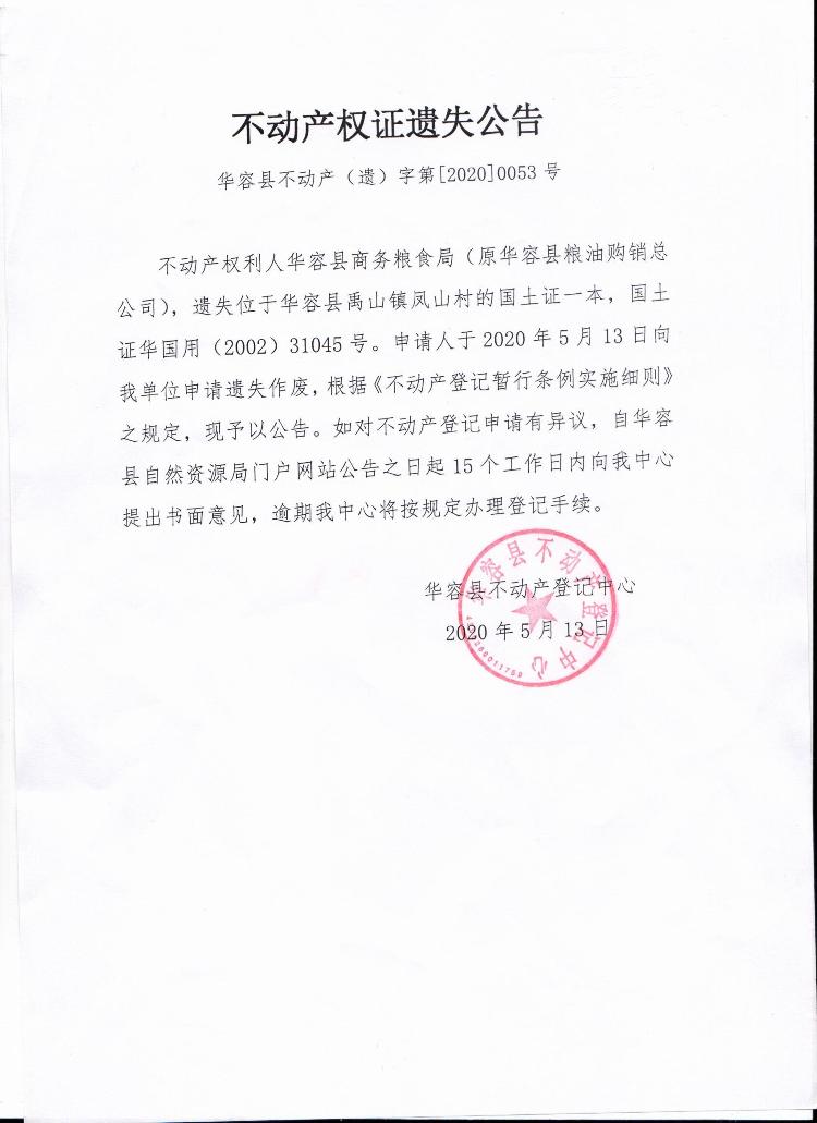 不动产权证遗失公告【国土证(华容县商务粮食局)禹山镇凤山村】
