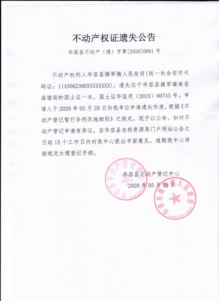 不动产权证遗失公告【国土证(华容县操军镇人民政府)】