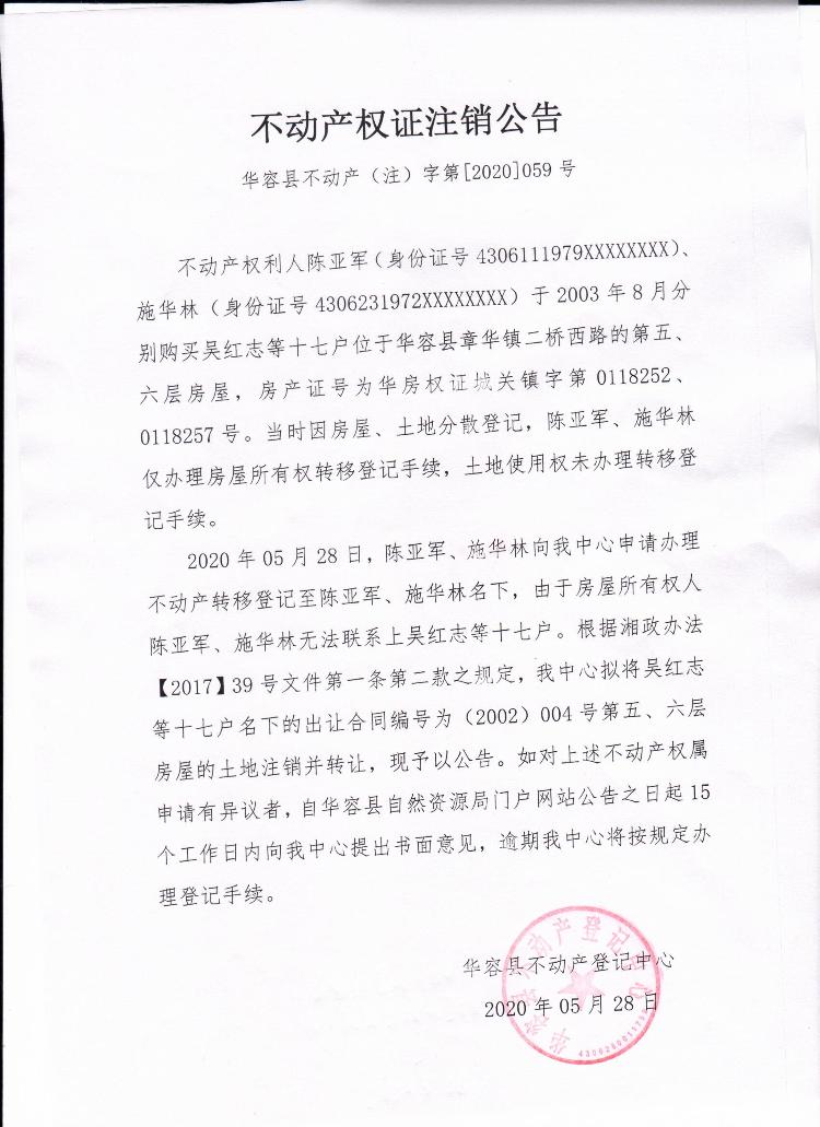 不动产权证书注销公告【(吴志红等17户转陈亚军 施华林)】