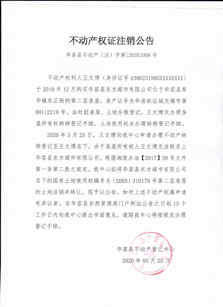 不动产权证书注销公告【(华容县东方超市有限公司转王文博)】