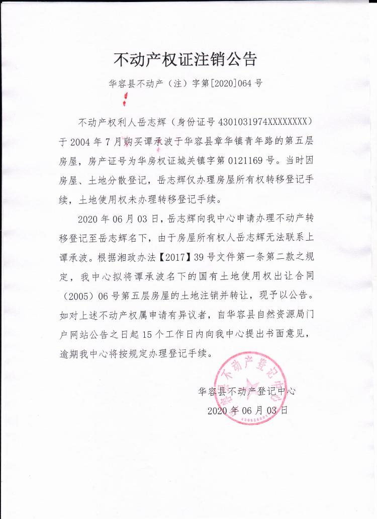 不动产权证书注销公告【(谭承波转岳志辉)】