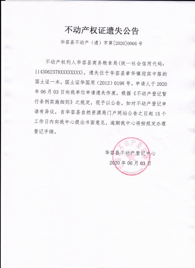 不动产权证遗失公告【国土证(华容县商务粮食局)章华镇迎宾中路】