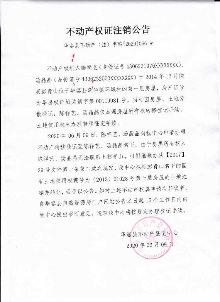 不动产权证书注销公告【(彭青山转陈祥艺、汤晶晶)】
