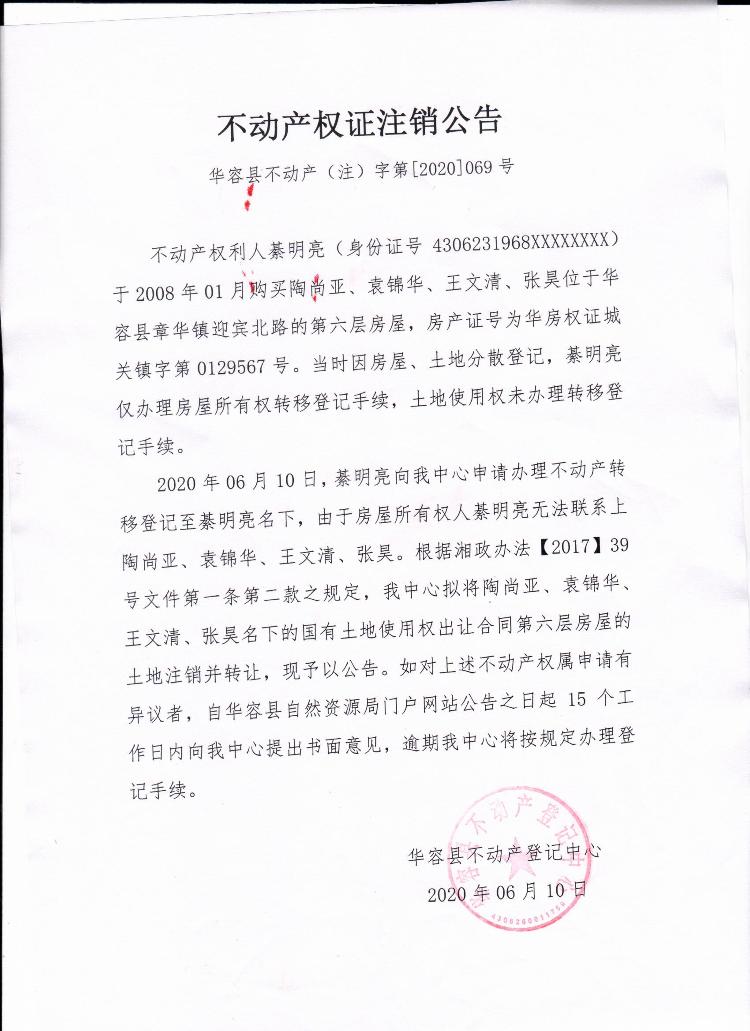 不动产权证书注销公告【(陶尚亚、袁锦华、王文清、张昊转綦明亮)】