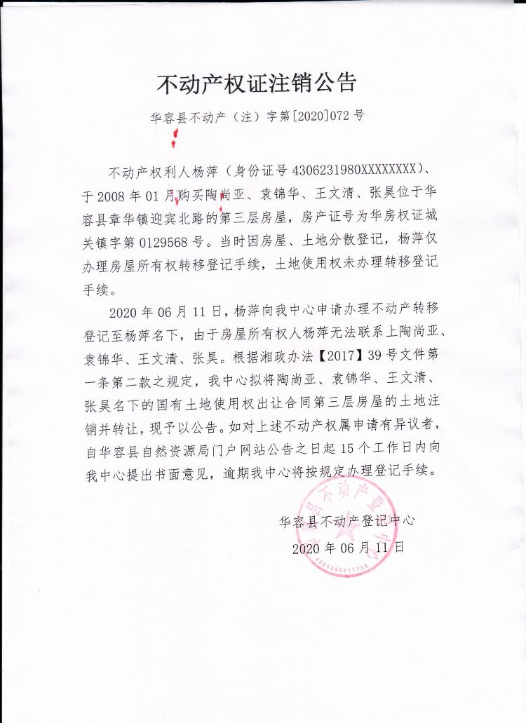 不动产权证书注销公告【(陶尚亚、袁锦华、王文清、张昊转杨萍)】