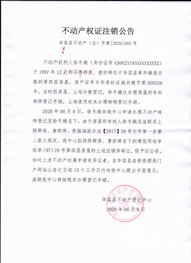 不动产权证书注销公告【(陈群英、唐宗琦转徐冬娥)】