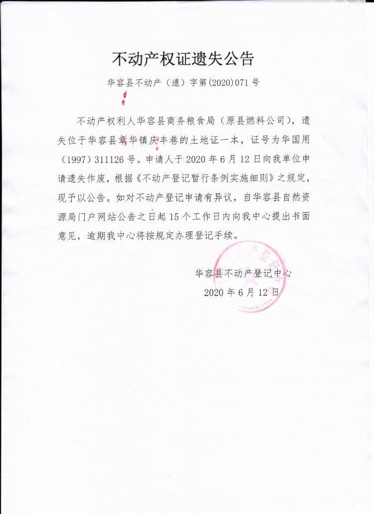 不动产权证遗失公告【国土证(华容县商务粮食局)原县燃料公司】