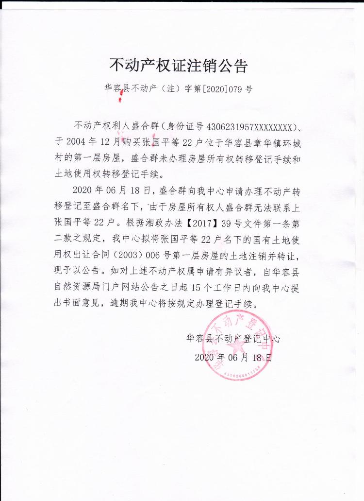 不动产权证书注销公告【(张国平等22户转盛合群)】