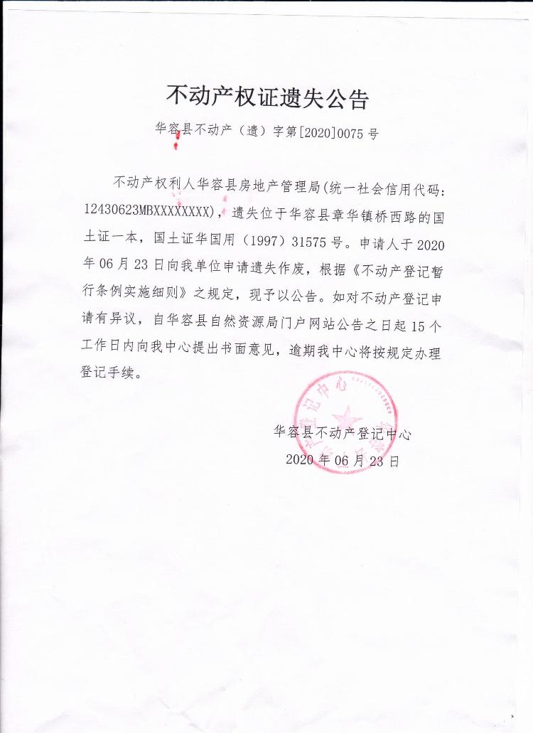 不动产权证遗失公告【国土证(华容县房地产管理局)桥西路】
