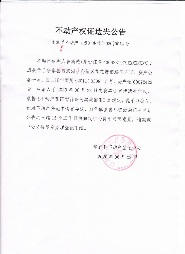 不动产权证遗失公告【国土证 房产证(曾新艳)】