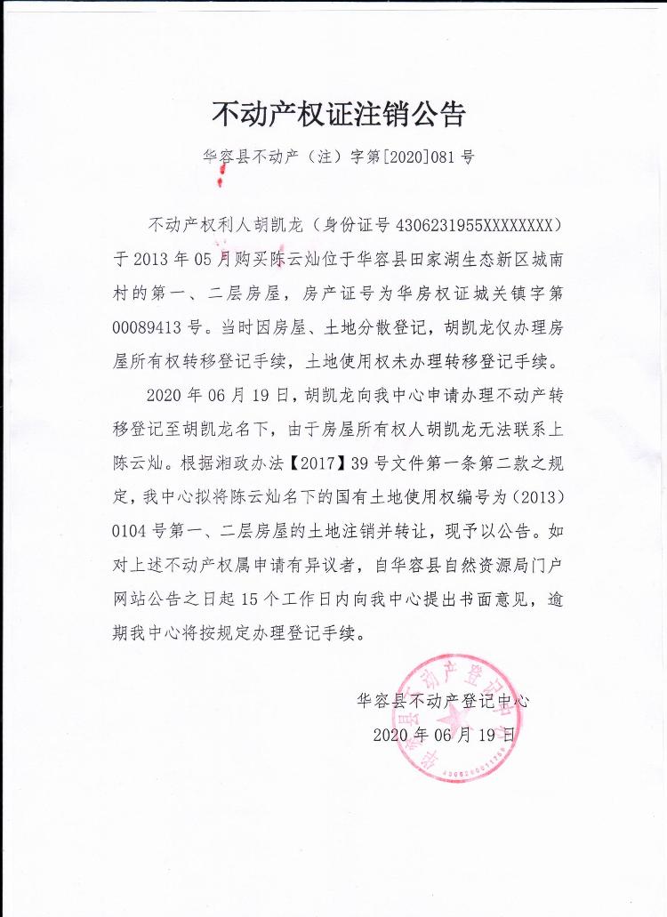 不动产权证书注销公告【(陈云灿转胡凯龙)】