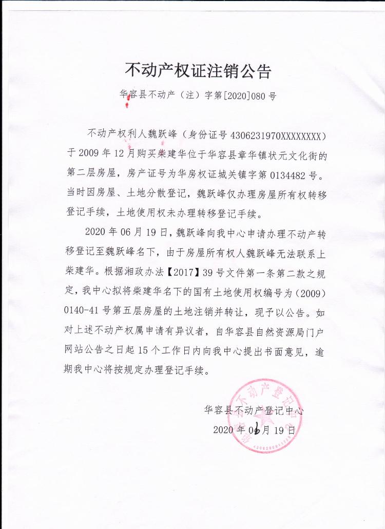 不动产权证书注销公告【(柴建华转魏跃峰)】