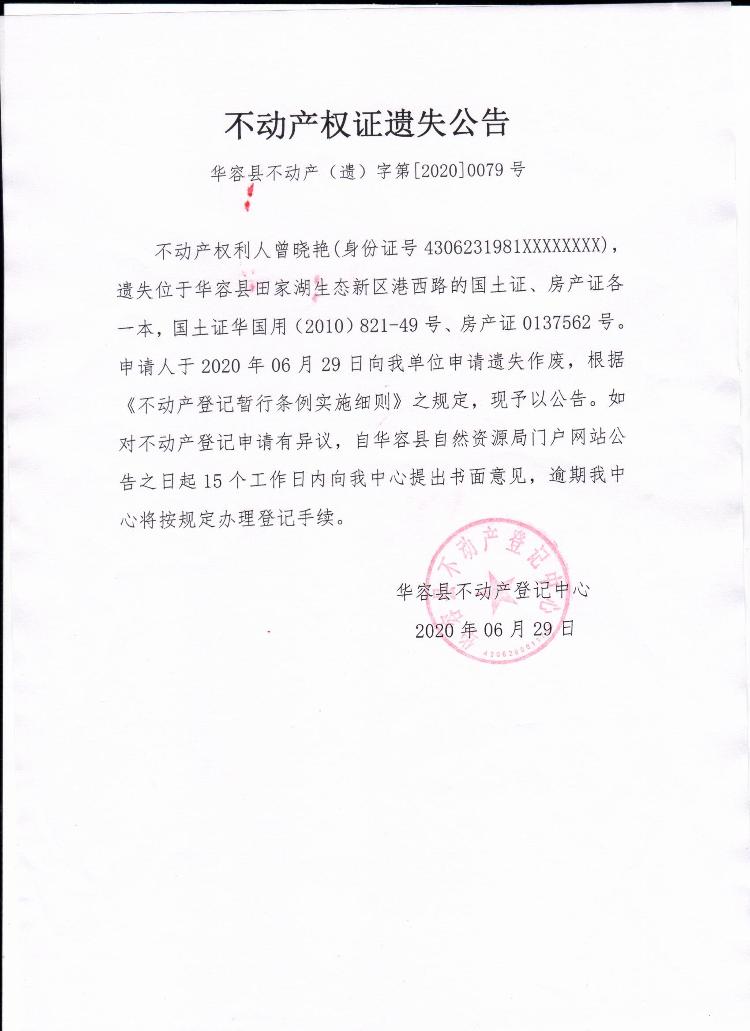 不动产权证遗失公告【国土证 房产证(曾晓艳)】