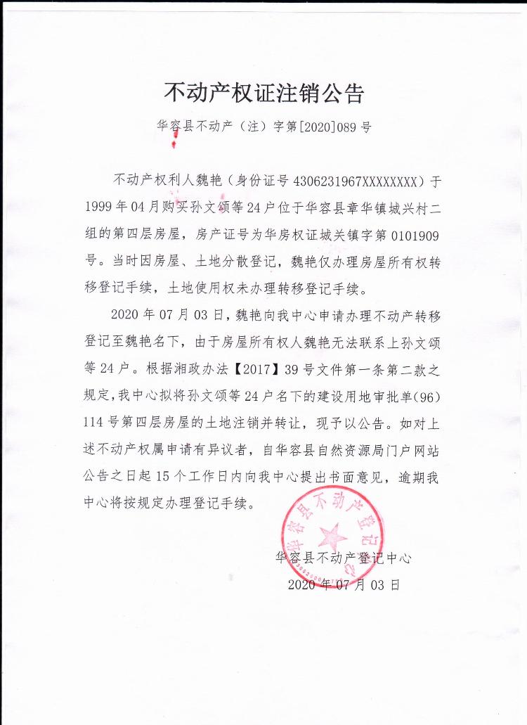不动产权证书注销公告【(孙文颂等24户转魏艳)】