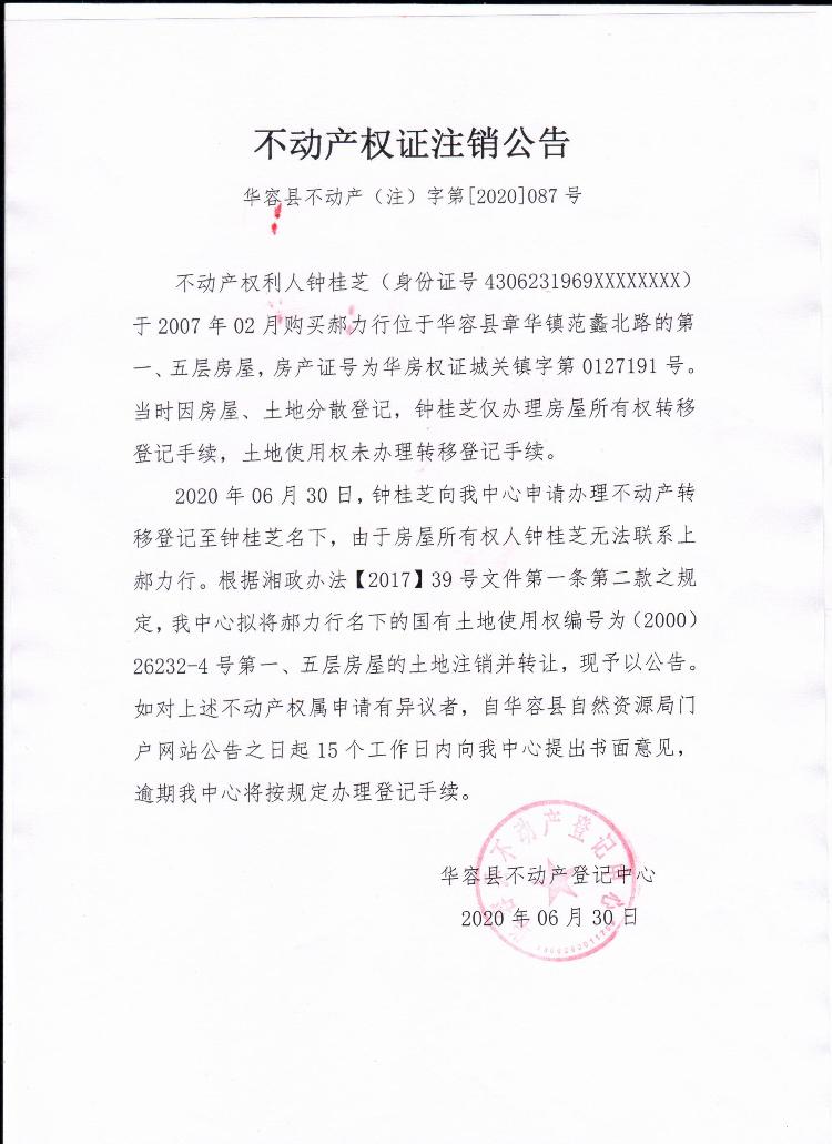 不动产权证书注销公告【(郝力行转钟桂芝)】