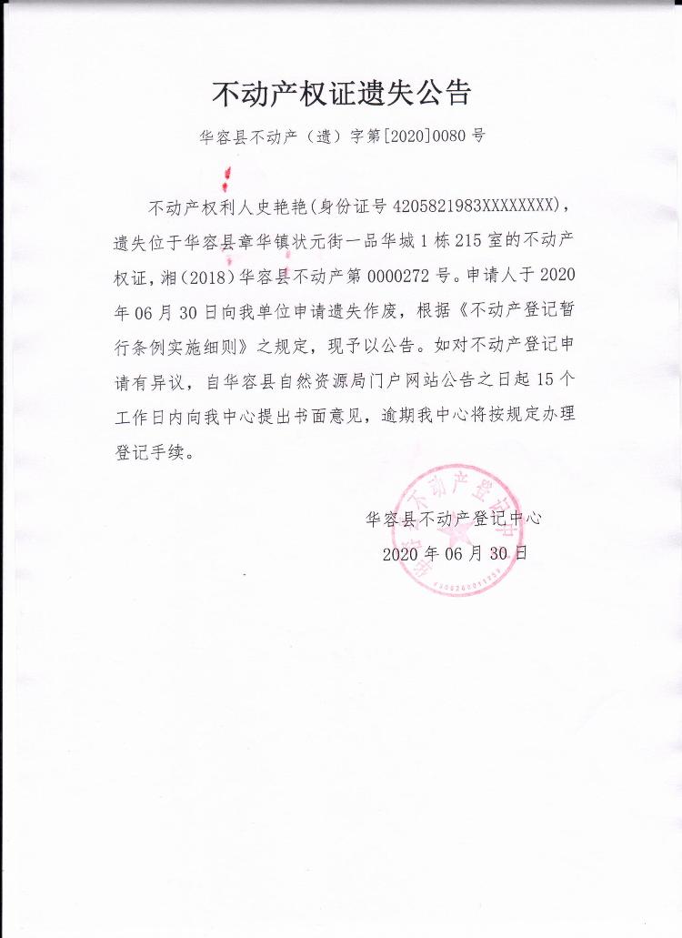 不动产权证遗失公告【不动产权证(史艳艳)】