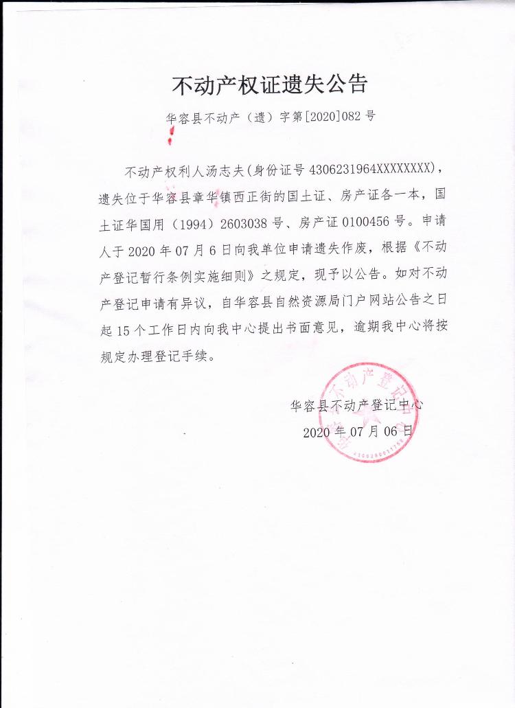 不动产权证遗失公告【国土证 房产证(汤志夫)】