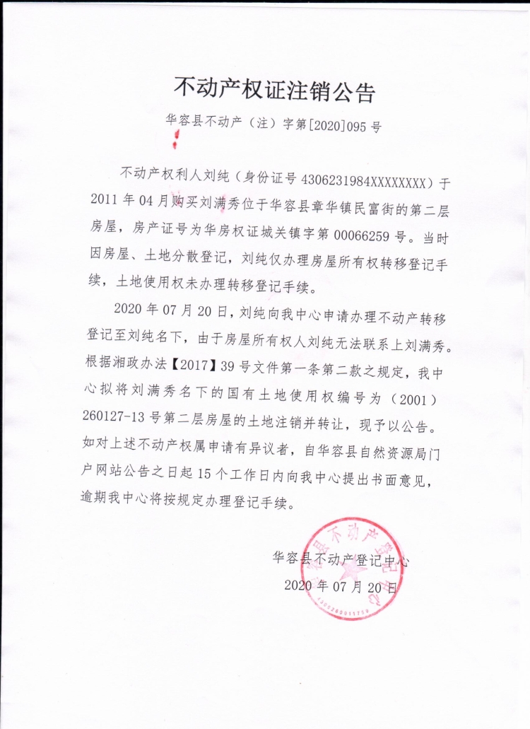 不动产权证书注销公告【(刘满秀转刘纯)】