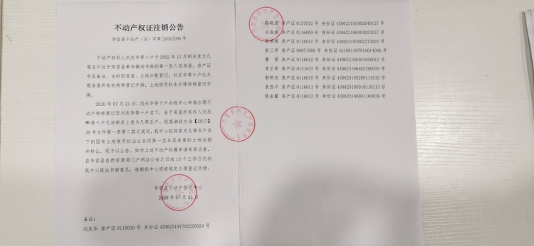 不动产权证书注销公告【(袁为凡等5户转刘庆华等10户)】