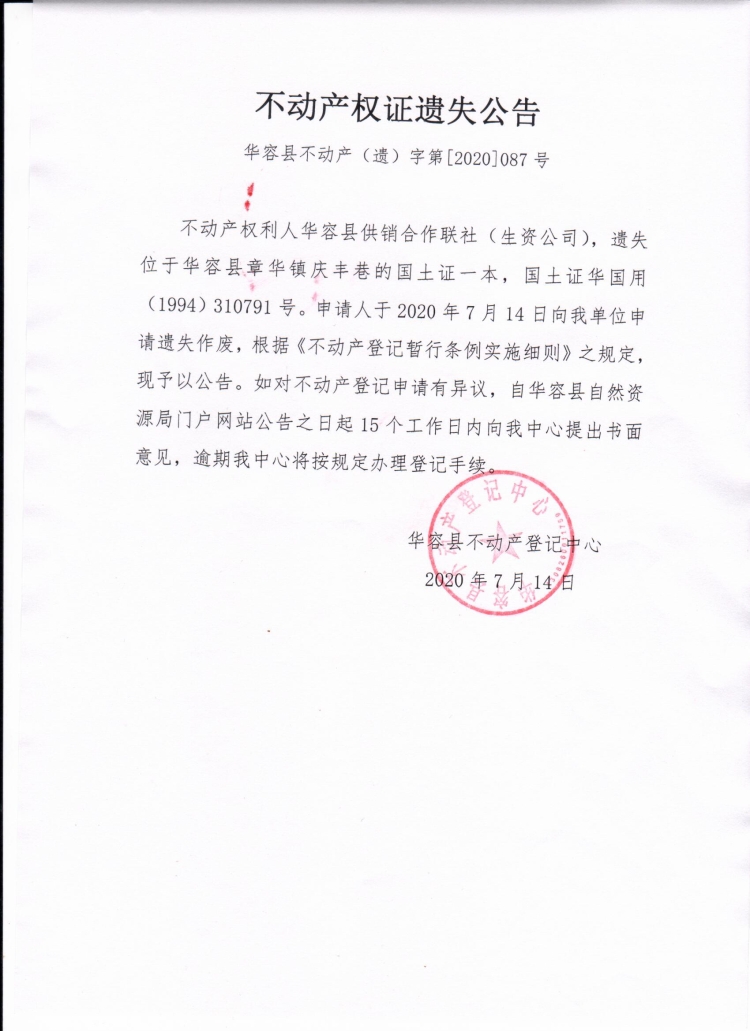 不动产权证遗失公告【国土证(华容县供销合作联社)生资公司】
