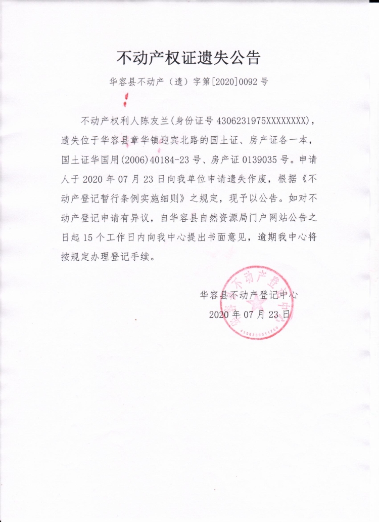 不动产权证遗失公告【国土证 房产证(陈友兰)】