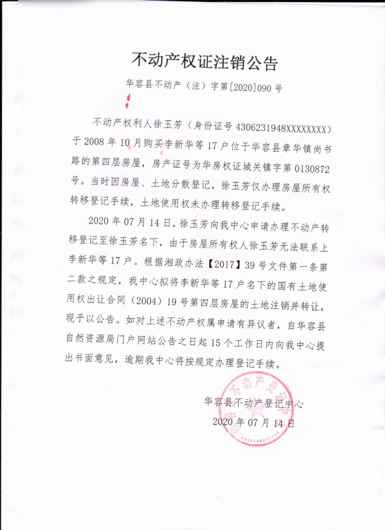 不动产权证书注销公告【(李新华等17户转徐玉芳)】
