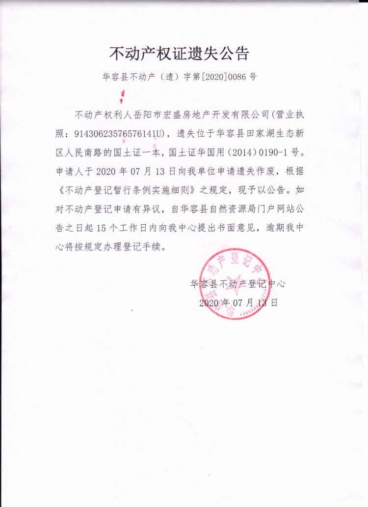不动产权证遗失公告【国土证(岳阳市宏盛房地产开发有限公司)】