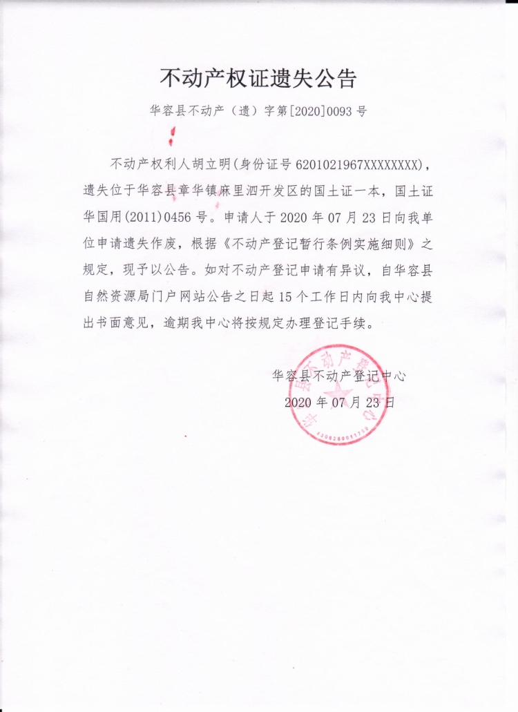 不动产权证遗失公告【国土证(胡立明)】