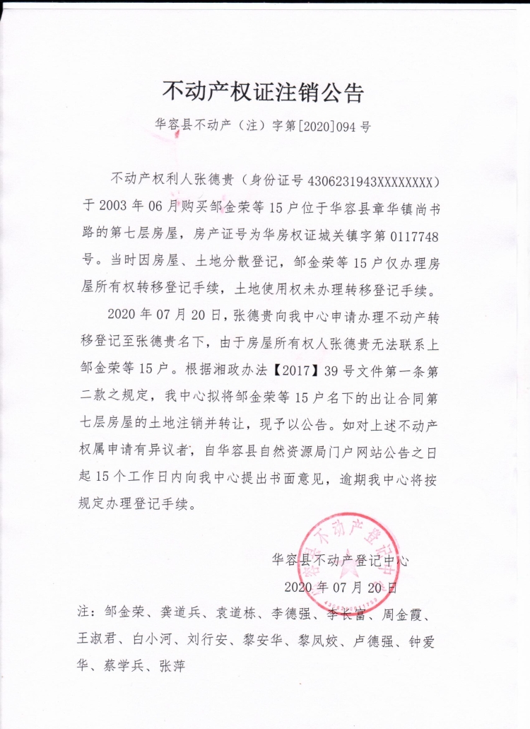 不动产权证书注销公告【(邹金荣等15户转张德贵)】