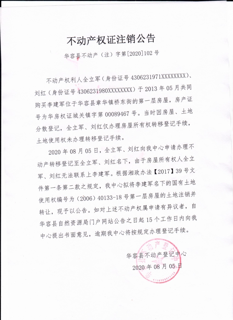 不动产权证书注销公告【(李建军转全立军、刘红)】