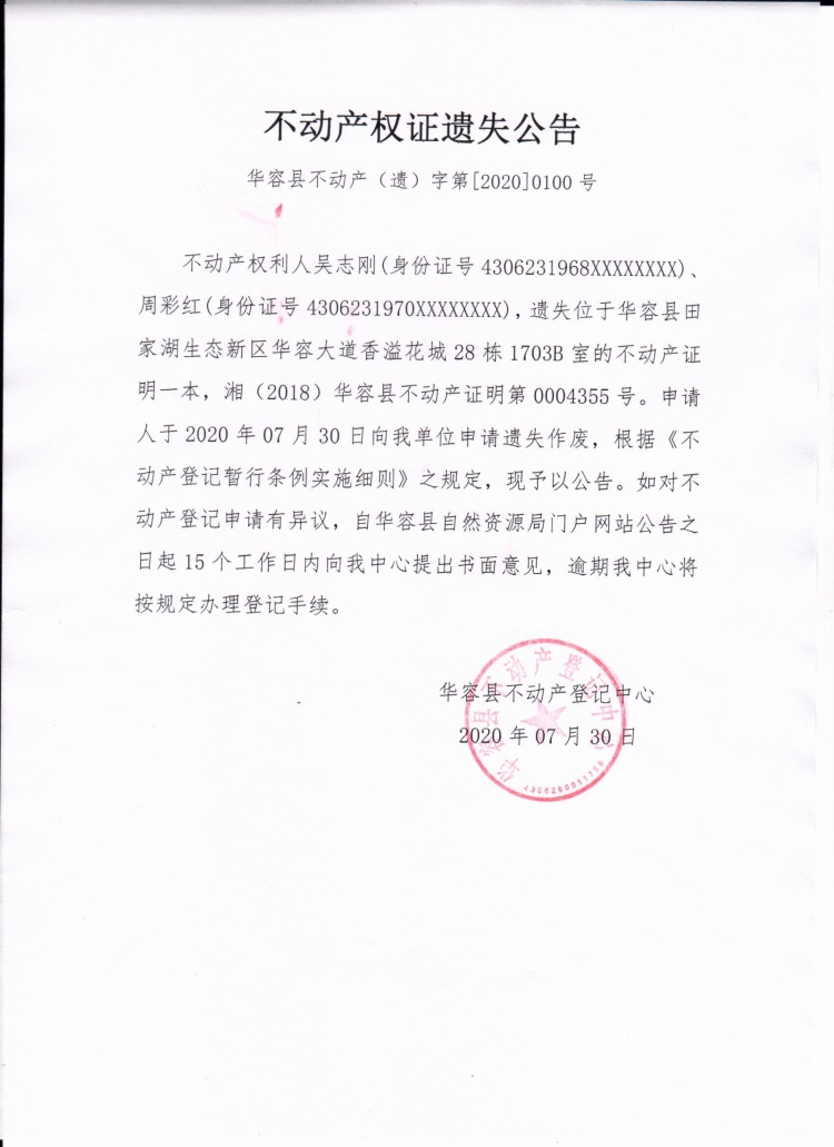 不动产权证遗失公告【不动产权证(吴志刚、周彩红)】