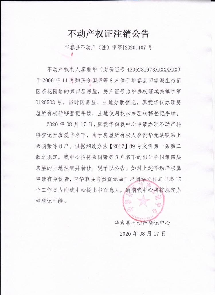 不动产权证注销公告【(余国荣等8户转廖爱华)】