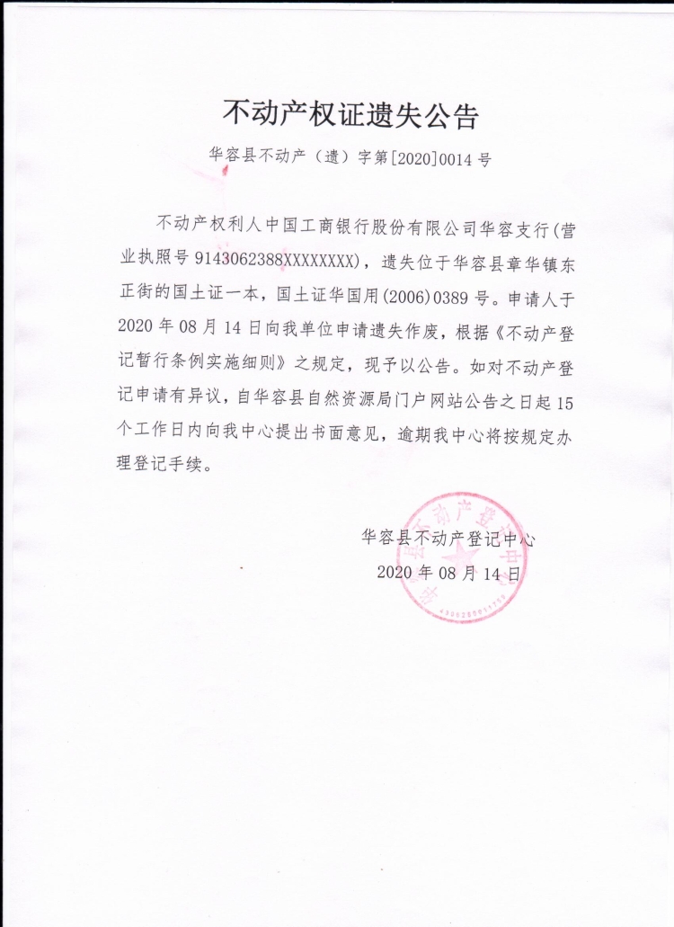 不动产权证遗失公告【国土证(中国工商银行股份有限公司华容支行)】