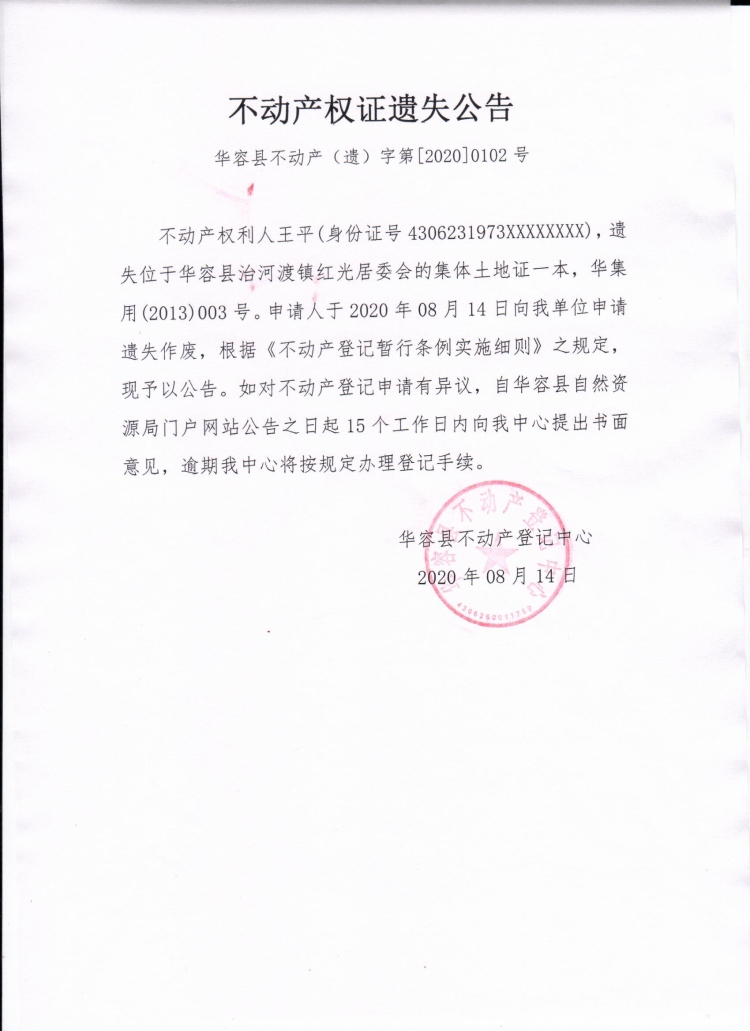 不动产权证遗失公告【集体土地证(王平)】