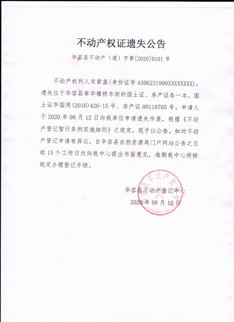 不动产权证遗失公告【国土证 房产证(宋紫菡)】
